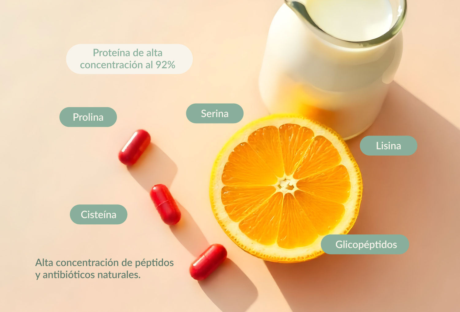 Ingredientes: Glicopéptidos, Mezcla de aminoácidos NO esenciales (Cisteína, Glicinica, Serina y Prolina) y Proteína de alta concentración al 92%