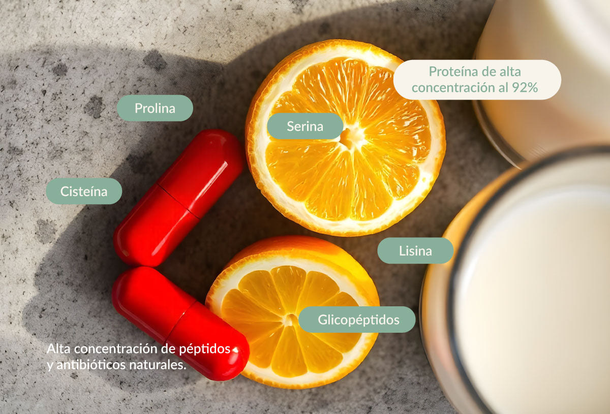 Ingredientes: Proteína de alta concentración al 92%. Glicopéptidos, Mezcla de Aminoácidos no esenciales (Cisteína, Lisina, Serina y Prolina).