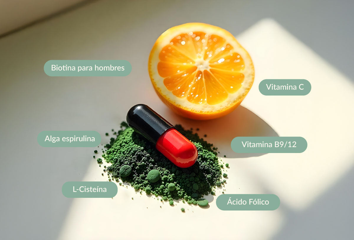 Ingredientes activos: Vitaminas B8 (Biotina), B9, B12 y C, Antioxidantes, Arginina, Espirulina.
